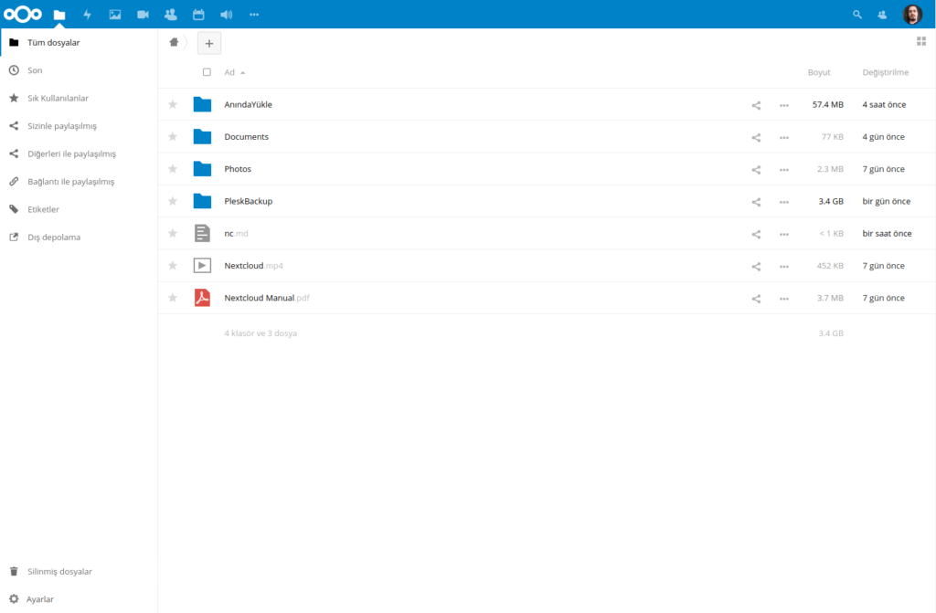 Yukarıdaki örnek görselde ownCloud’un sağ üstünde kullanıcının avatarını görüyorsunuz. Nextcloud’da da aynı şekilde. Ancak ownCloud’da ben avatarı sadece kullanıcı sayfasında görüyordum. Avatar yerinde, varsa ad soyad, yoksa kullanıcı adı görünüyordu. Belki bir eklenti veya yapılandırma değişimi ile bu mümkün olabiliyordur, bilgim yok. Ancak Nextcloud doğrudan bu özellik ile geliyor. Görsel açıdan yine bir artı puan olarak görüyorum bunu.